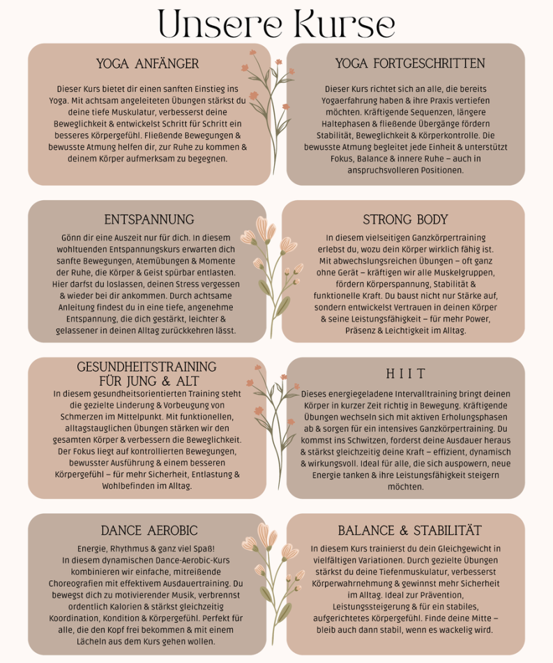 Unsere Kurse sind fester Bestandteil deiner Mitgliedschaft bei uns - und dein ergänzender Schlüssel zu mehr Kraft, Beweglichkeit und Wohlbefinden.